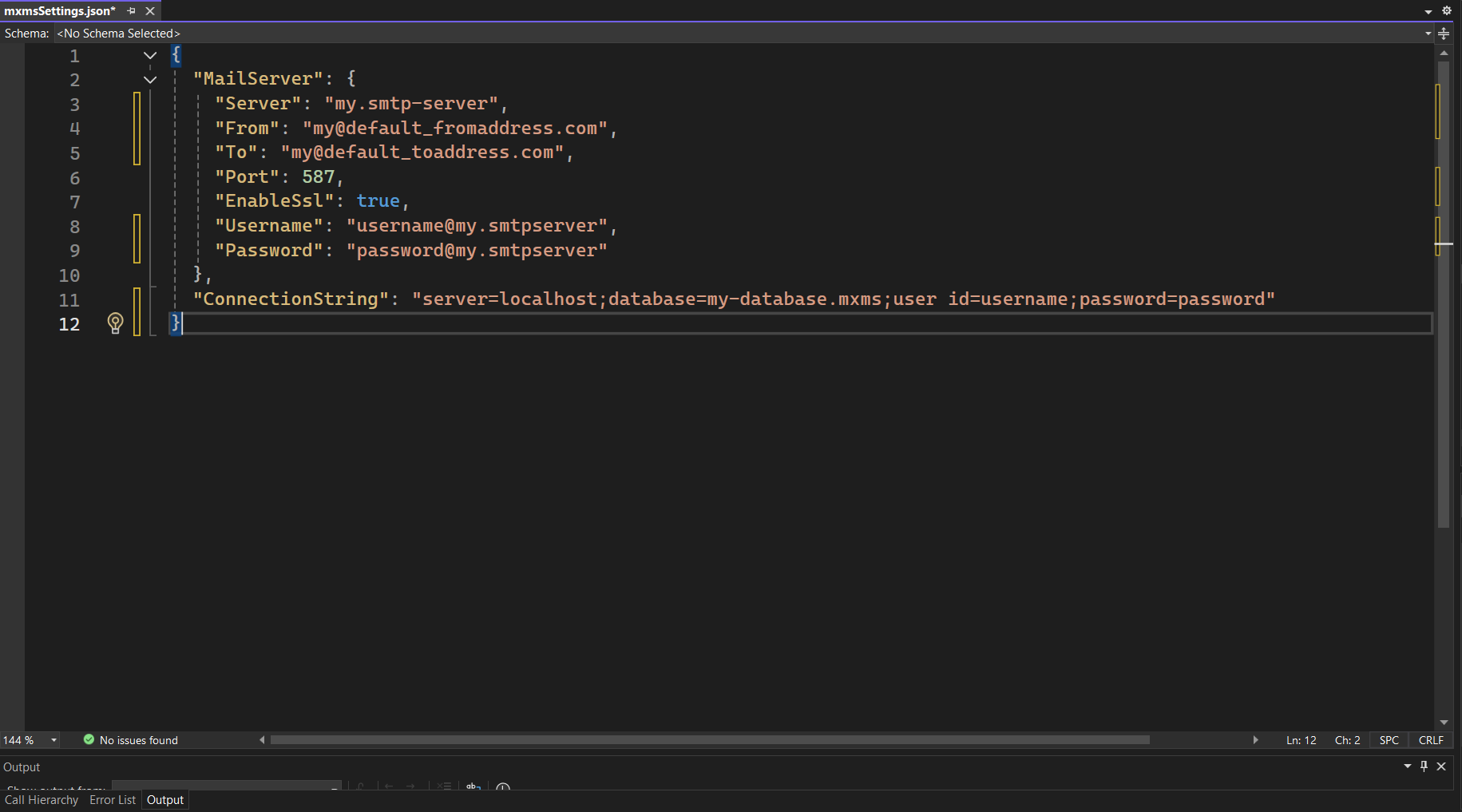 An example mxmsSettings.json file open in Visual Studio